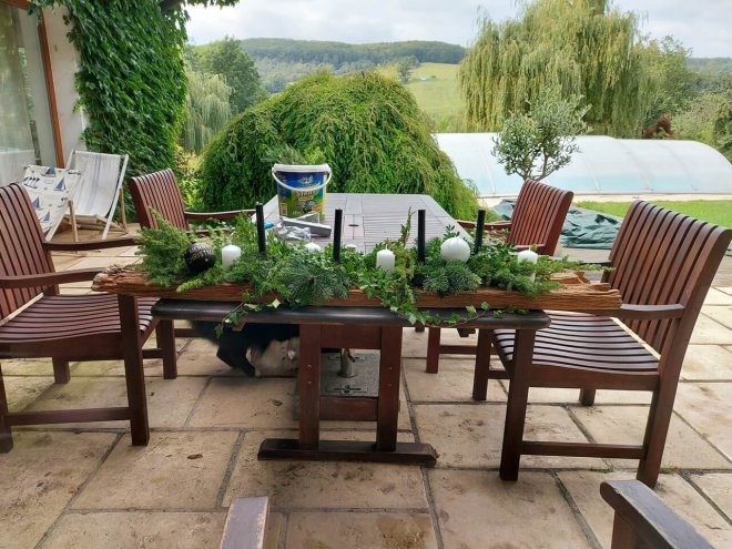 A príprava vianočného stolovania mohla začať. Hlavnou ozdobou stola bol krásny, biely, obrus. Zelená dekorácia na starom dreve len podčiarkla jeho výnimočnosť a jedinečnosť. Samotný jedálenský servis, ako taniere, misky, príbory a poháre už s akousi samozrejmosťou dopĺňali sviatočnú atmosféru.