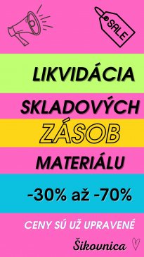 V Šikovnici aktuálne prebieha totálny výpredaj skladových zásob materiálu. Zľavy sú od 30% do 70% a v akcii je všetok materiál. Nenechajte si ujsť túto príležitosť a nakúpte s výraznou zľavou. Ponuka materiálu je široká - niekoľko tisíc druhov tovaru :)