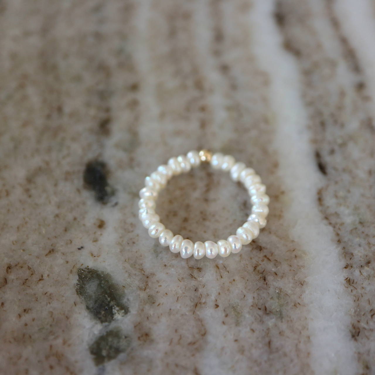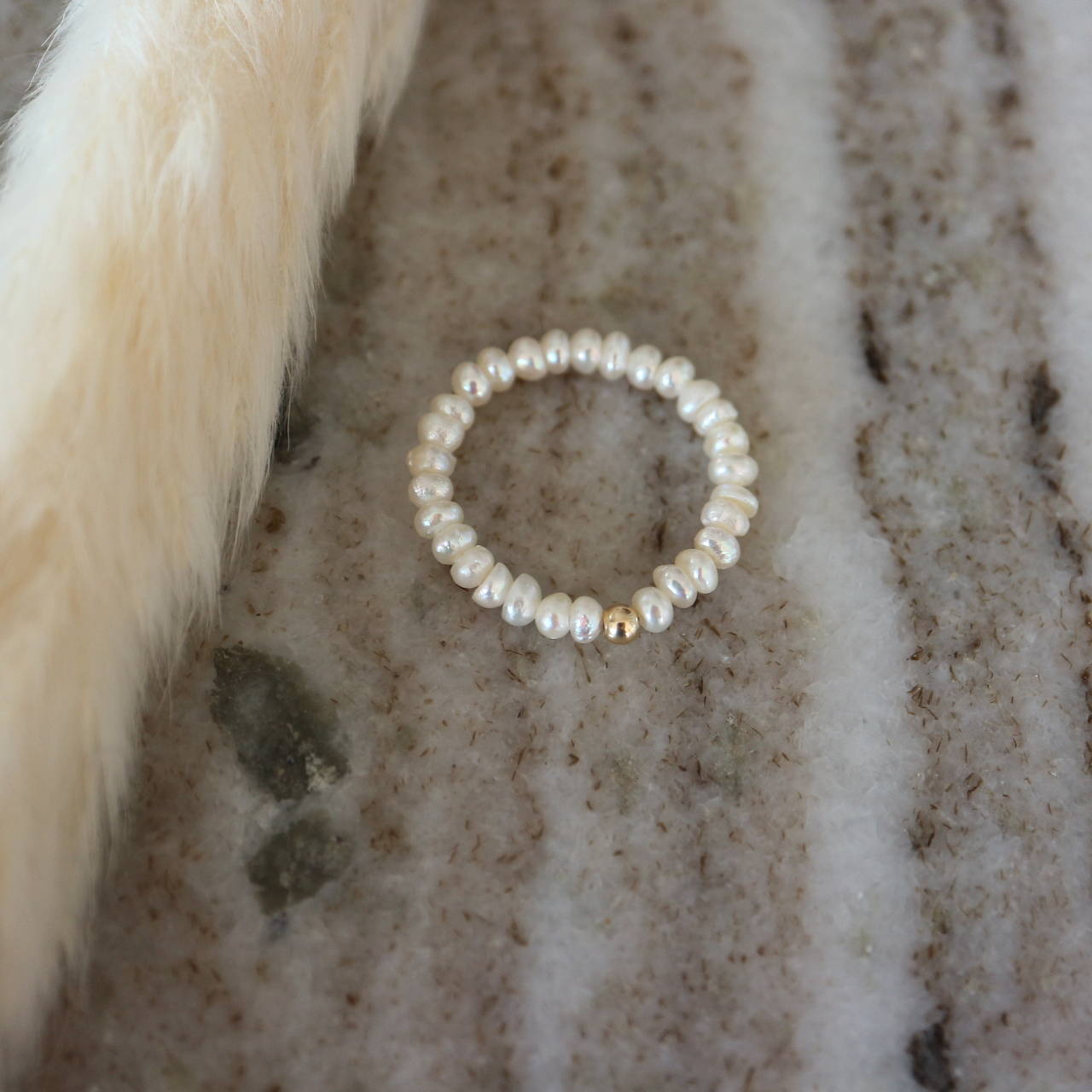 Minimalistický prstýnek z malinkých zploštělých sladkovodních perliček a zlatého korálku.