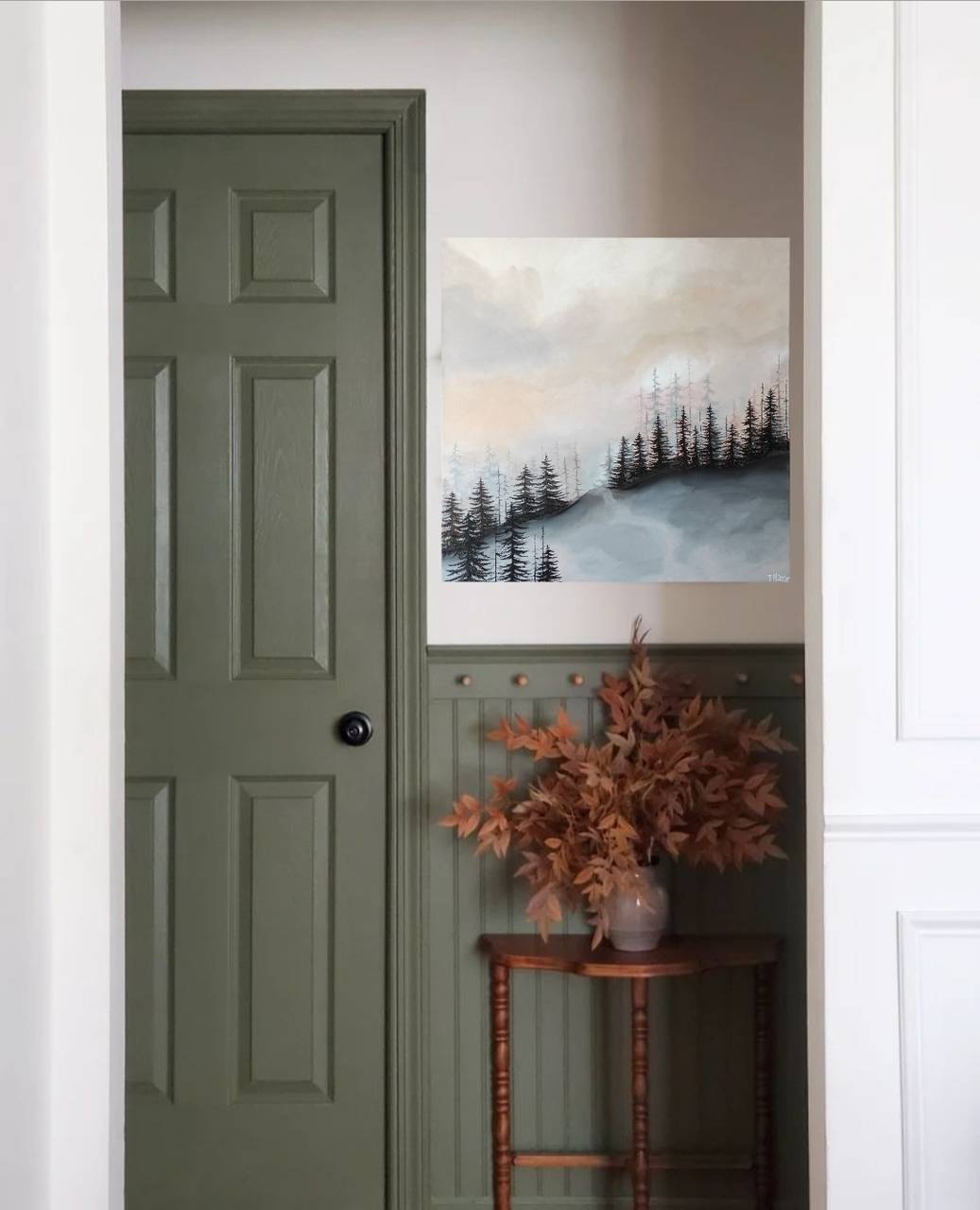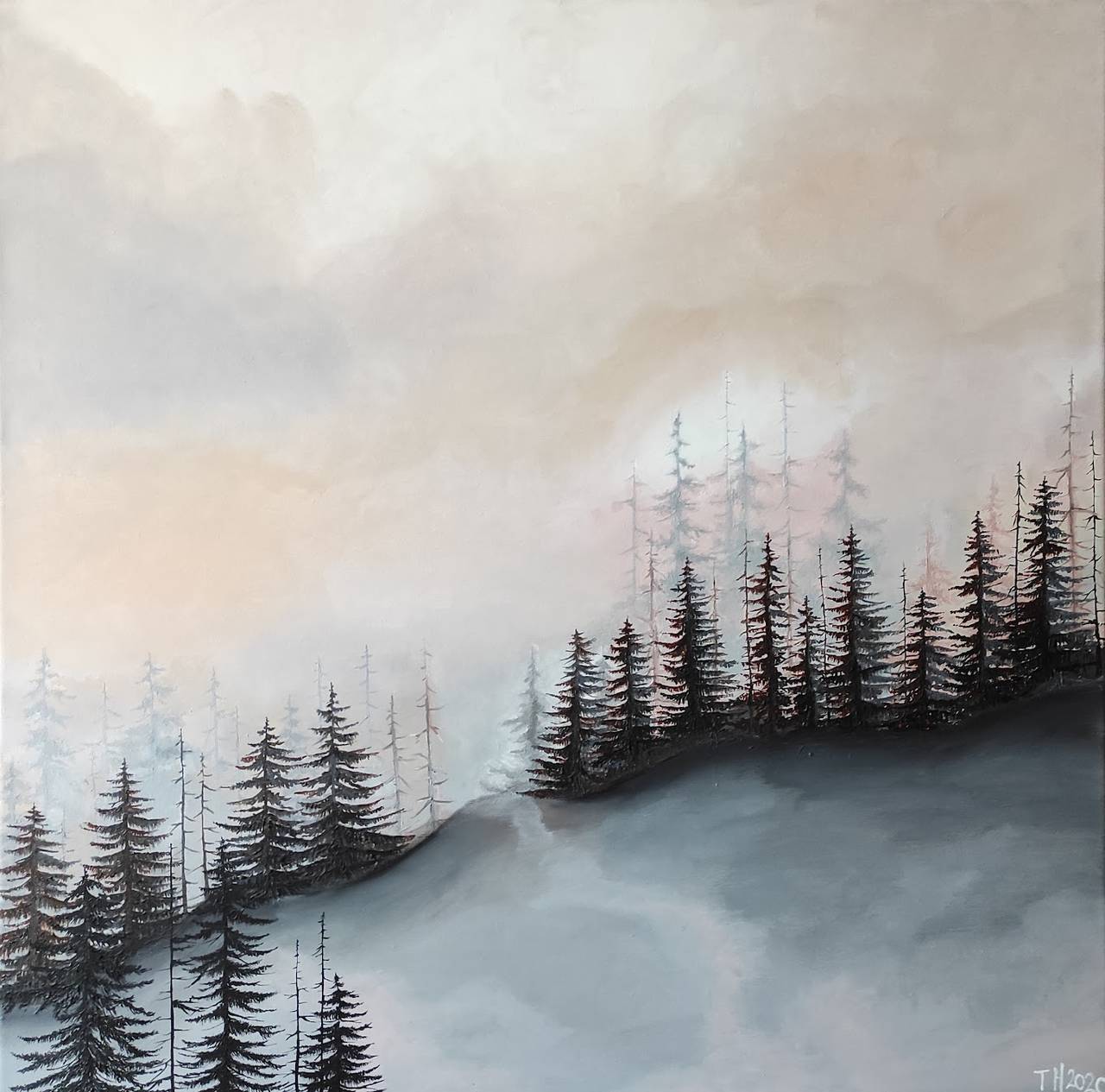 Obraz upokojujúcej krajiny inšpirovanej slovenskou prírodou v minimalistickom farebnom prevedení.