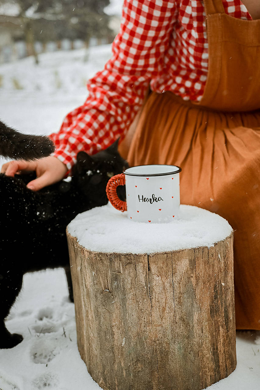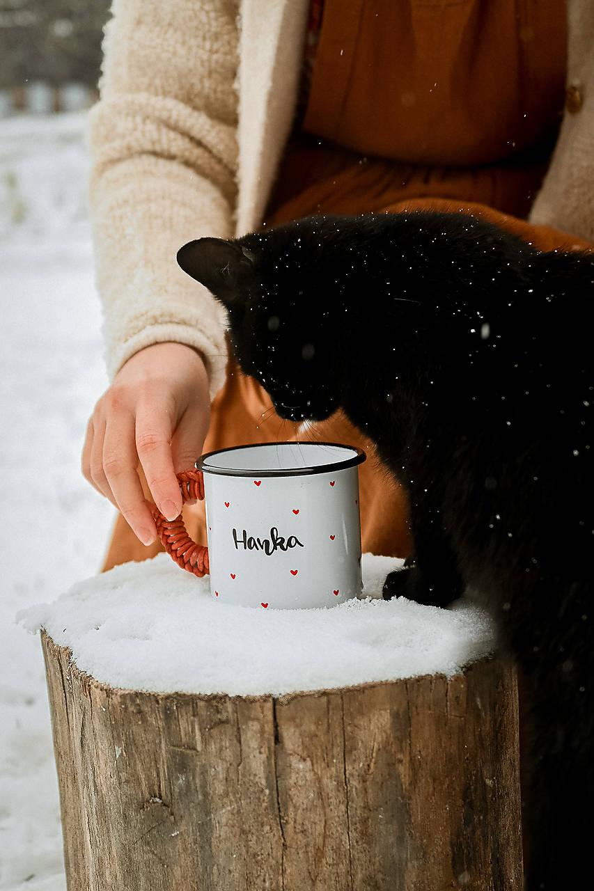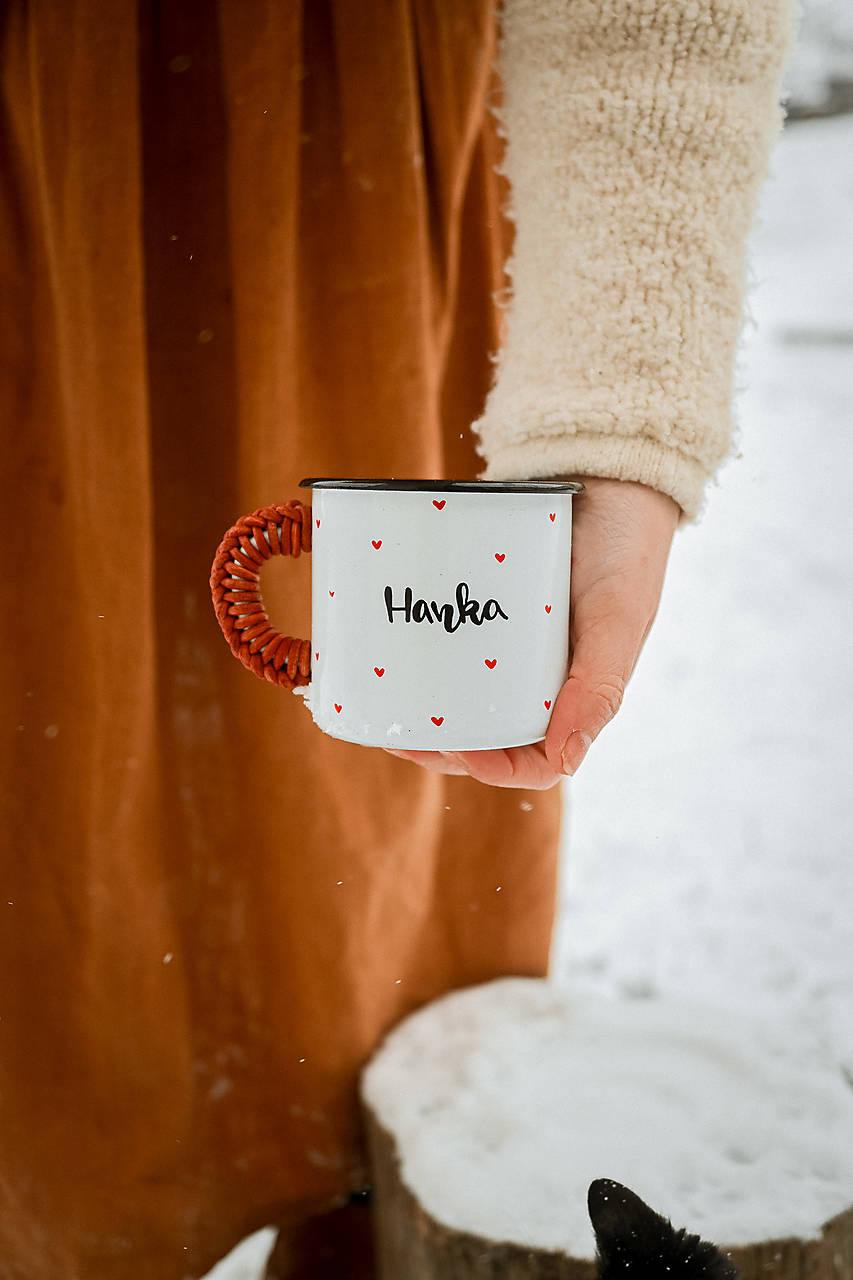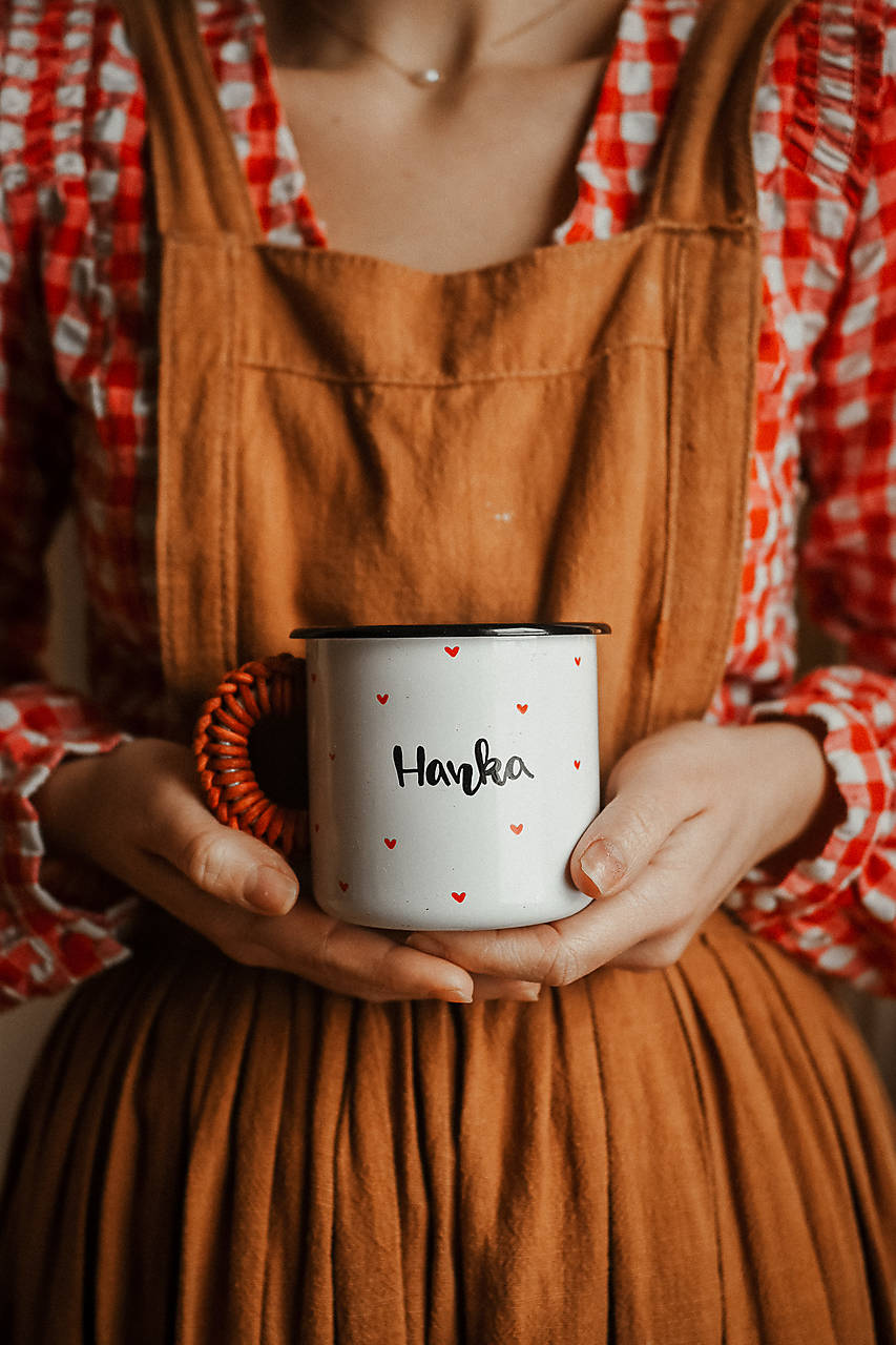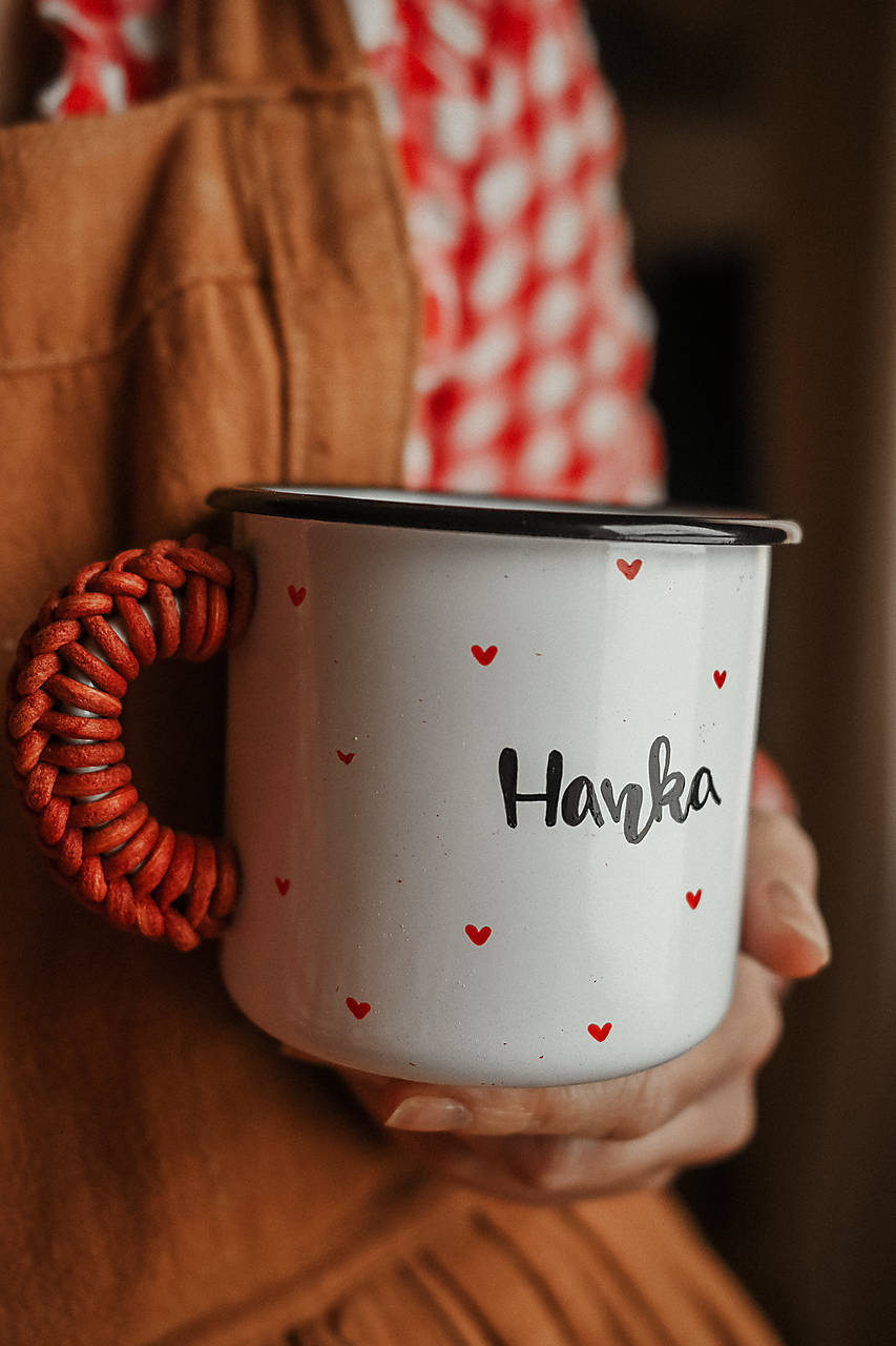 Motív na hrnčeku je maľovaný červenou fixou určenou na smaltovaný povrch. Fixovanou teplom. Uško hrnčeka je opletené červenou kožou.