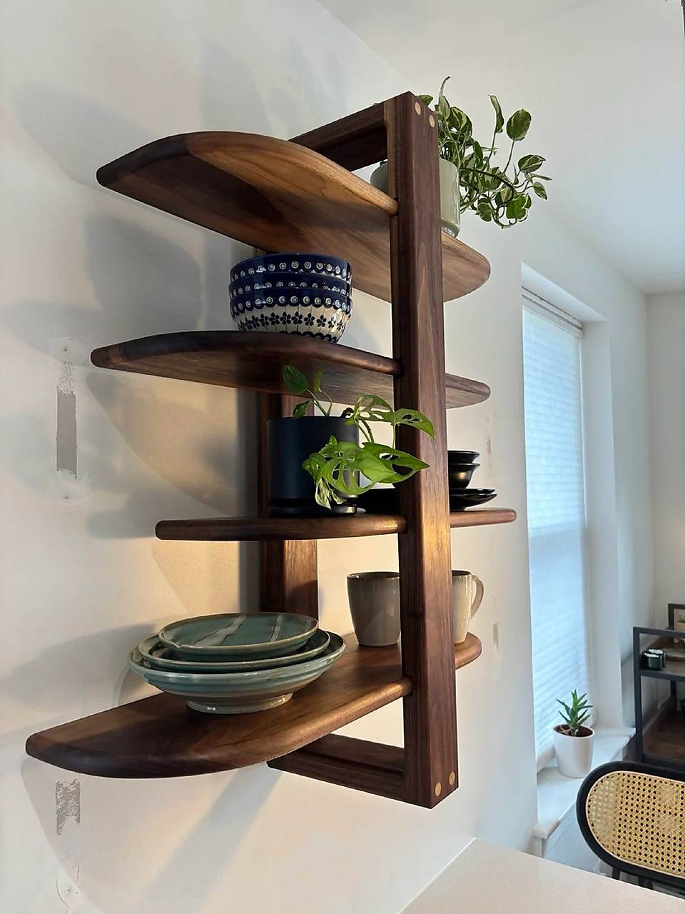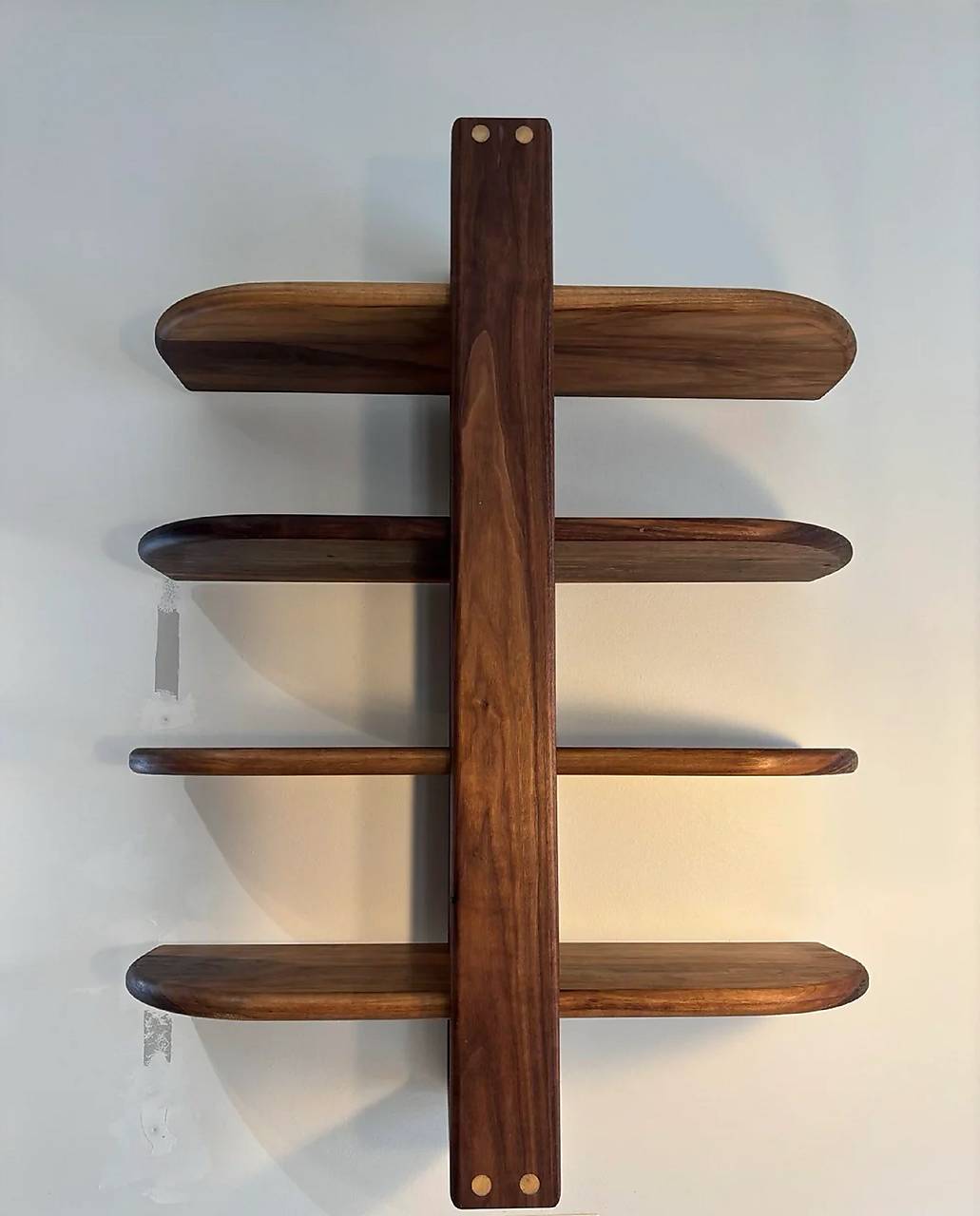 Ručne a poctivo vyrobená polica z masívneho, tvrdého a luxusného orechového dreva. Polica sa skladá zo 4 úložných sekcií. Každá vodorovná úložná časť je v rohoch zaoblená, čím sa docieli veľmi pekný vzhľad police. Okrem zaoblenia predných rohov, sú hrany úložných častí police zaoblené a do jemna vybrúsené. Rám police je pevne prelepený a z prednej časti sú ponechané viditeľné kolíky kvôli estetike. Celá polica je veľmi pevná a robustná. Ako povrchová úprava je použitý transparentný tvrdý voskový olej v dvoch vrstvách. K polici je dodávané kompletné kovanie k montáži.