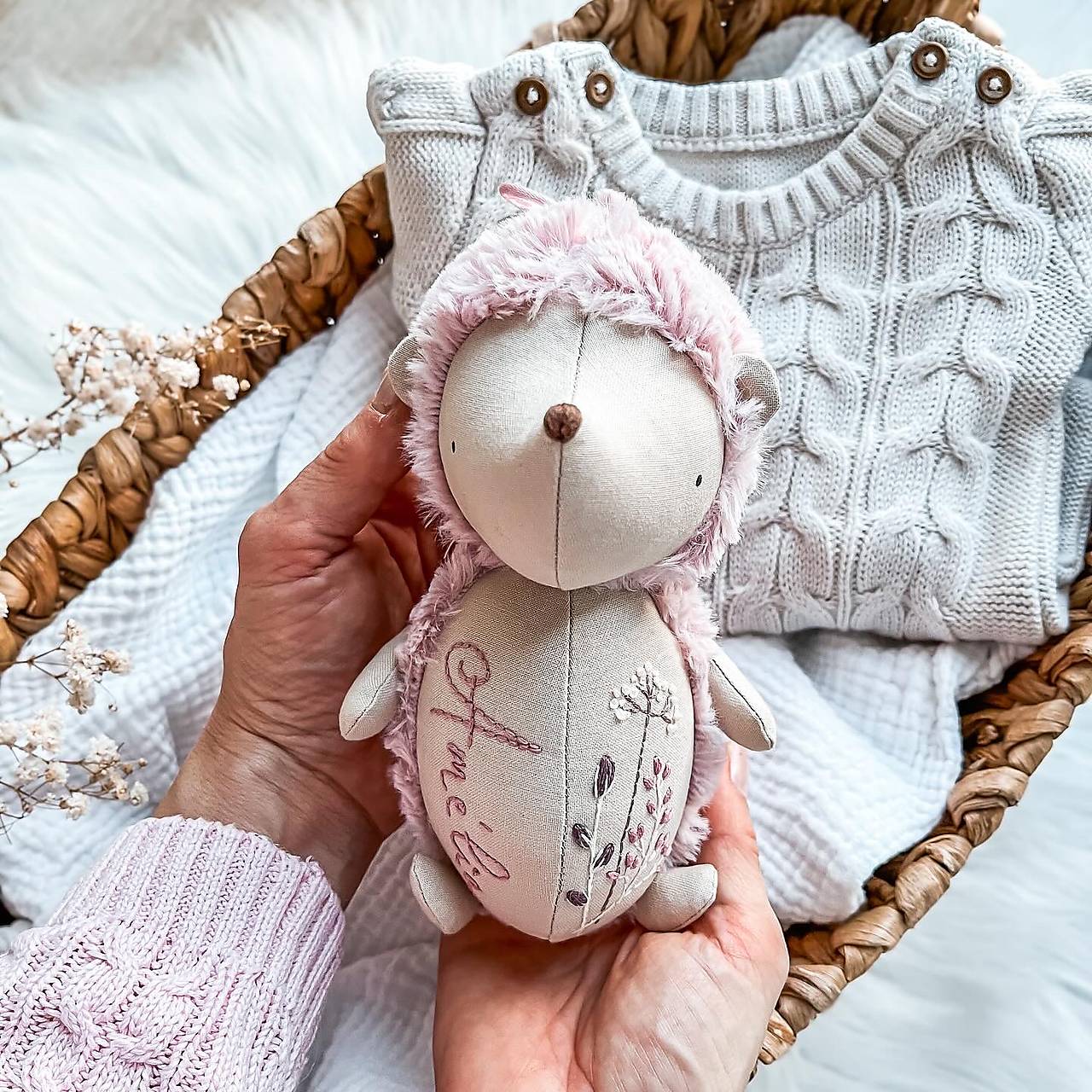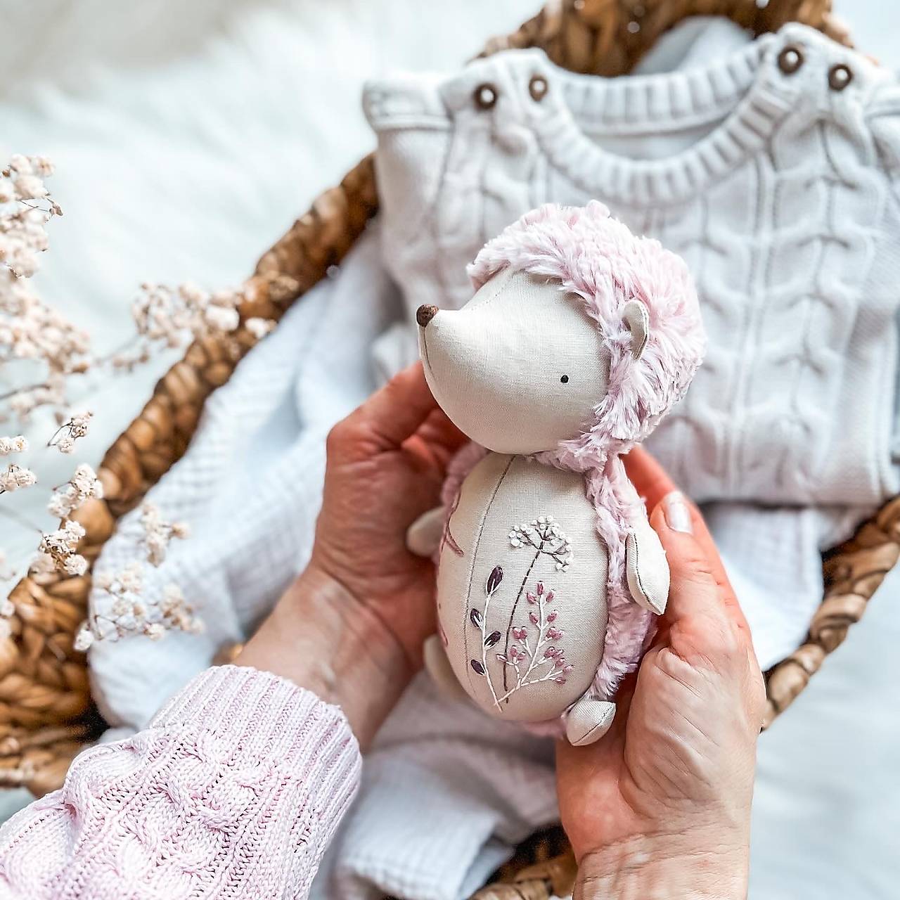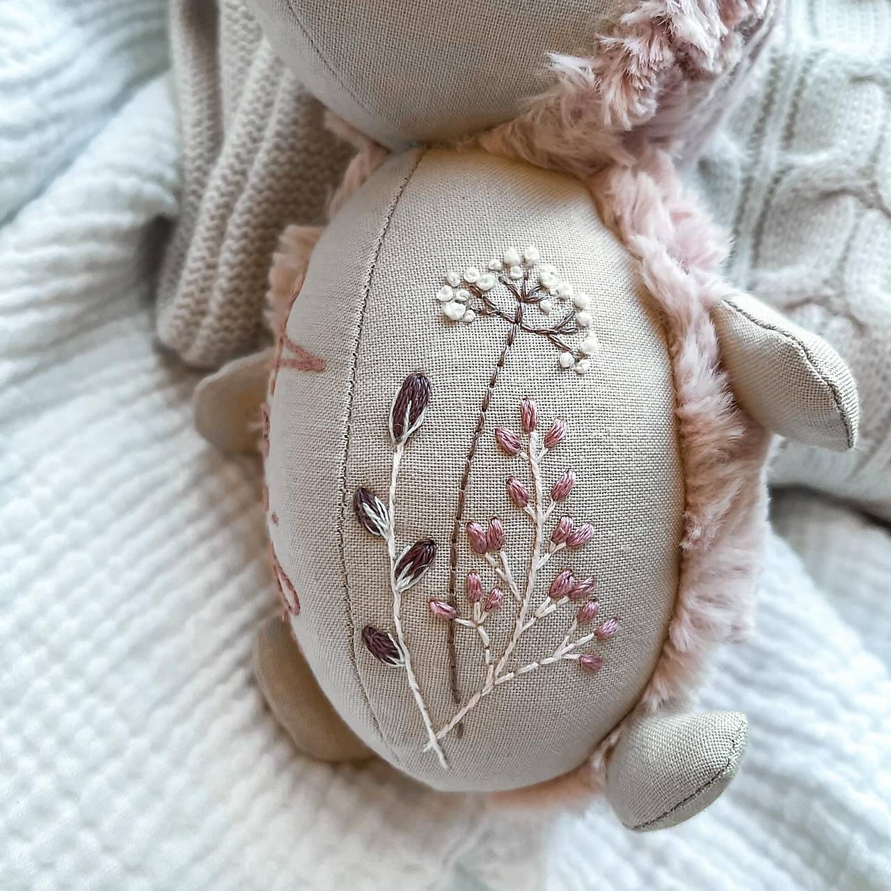 Ježko je ozdobený precíznou ručnou výšivkou. Rúčky, nôžky a ušká sú ručne našité.
